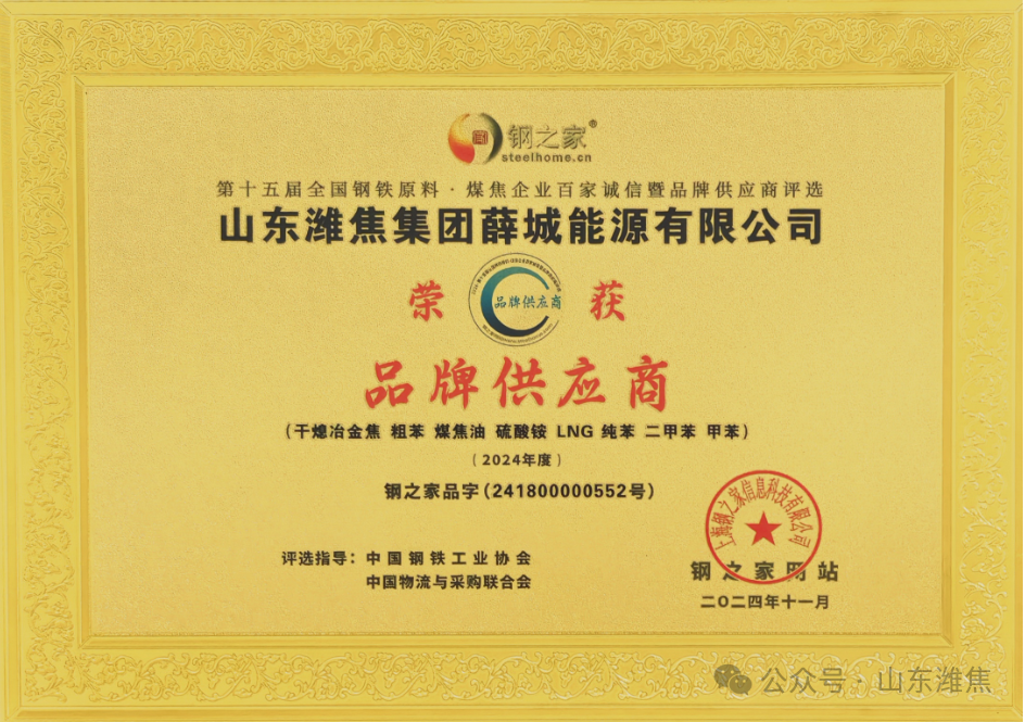 近日,“鋼之家第十五屆全國鋼鐵原料·煤焦企業(yè)百家誠信暨品牌供應(yīng)商”評選活動順利舉行,經(jīng)鋼之家網(wǎng)站征信取證,中國鋼鐵工業(yè)協(xié)會及中國物流與采購聯(lián)合會專家評審,薛城能源公司被評為2024年度“品牌供應(yīng)商”殊榮。