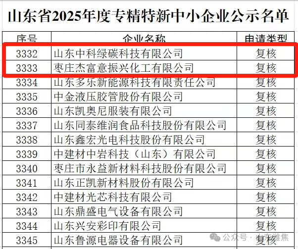 近日,山東省工信廳公布2025 年度專(zhuān)精特新中小企業(yè)名單,山東中科綠碳公司、棗莊杰富意公司順利通過(guò)復(fù)核。